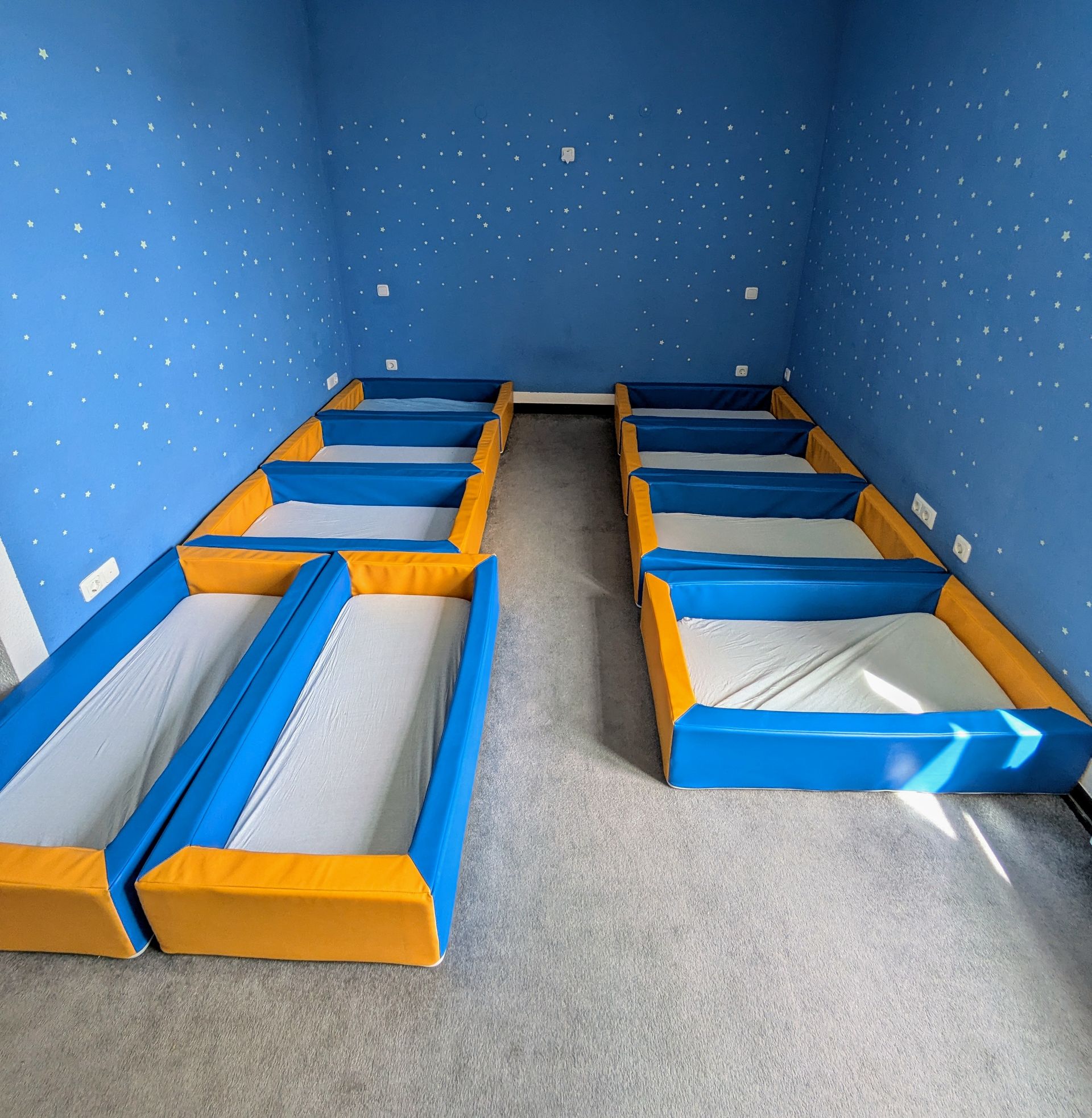 „Weißt du, wie viele Sternlein stehen“? Bei uns wird dieses schöne Lied lebendig, denn beim Zählen der Sterne in einer angenehmen, ruhigen Atmosphäre können sich die kleinen Schätze entspannt auf den Schlaf vorbereiten. Während wir gemeinsam die funkelnden Sterne betrachten fühlen sich die Kinder geborgen und wohl. So findet jeder kleine Schatz in seinem Bett im Schlafraum einen ruhigen und sicheren Ort zum Träumen und Schlafen.