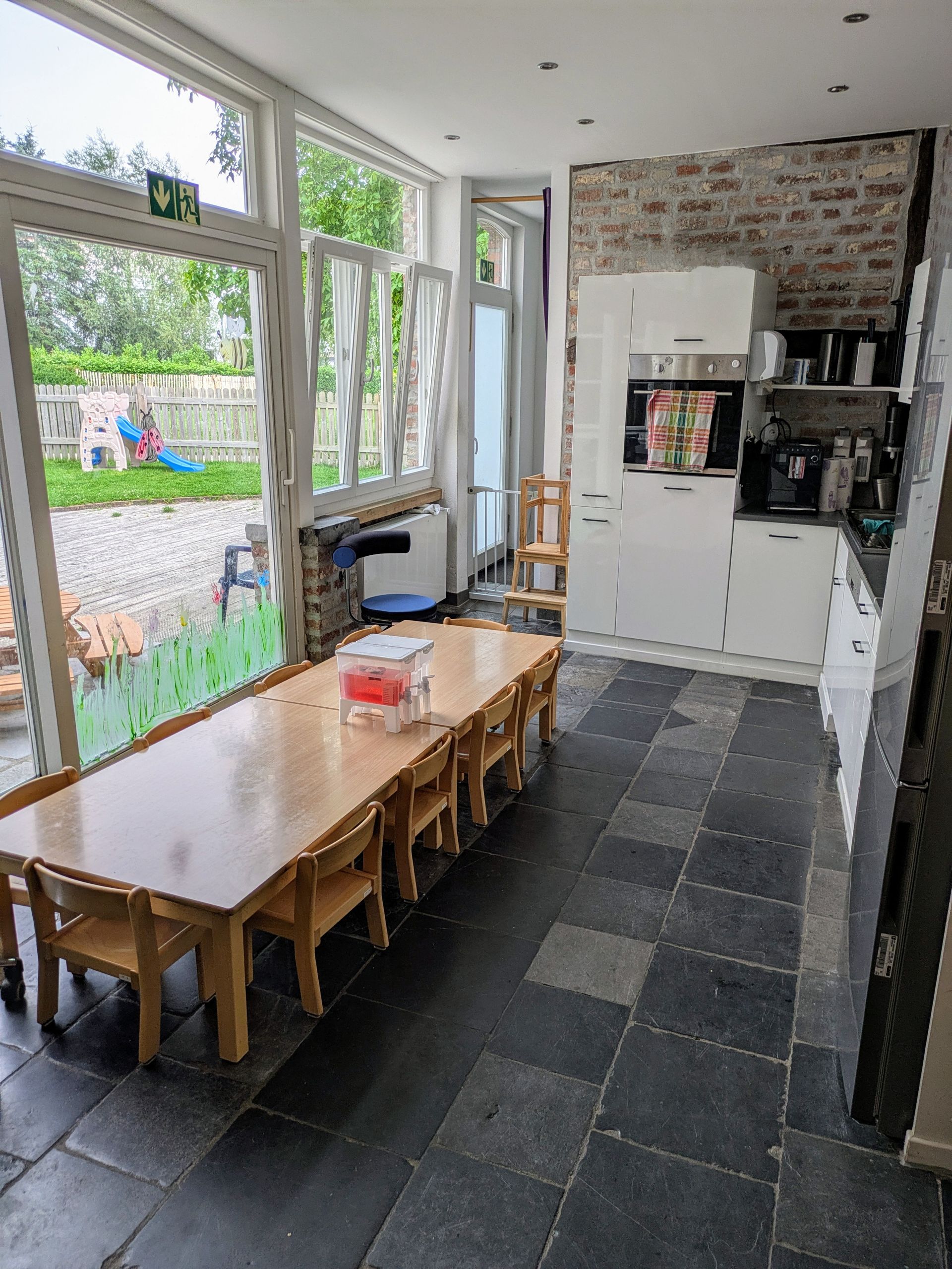 Hier erleben die Tageskinder jeden Tag besondere Momente des gemeinsamen Essens und kreativen Schaffens. An kindgerechten Tischen und Stühlen bereiten wir zusammen mit den Kindern das Essen vor – ein spannender und lehrreicher Moment, bei dem die Kleinen spielerisch lernen, wie man gemeinsam kocht und sich um das Essen kümmert. Nach der Zubereitung genießen wir gemeinsam unser Frühstück, Mittagessen und Snacks – so wird das Essen zu einem Erlebnis. Neben dem Essen lädt unsere Küche auch zum Malen ein. An den Tischen entstehen bunte Kunstwerke, die die Kinder mit viel Freude und Fantasie gestalten. Dieser kreative Raum fördert die Feinmotorik, die Fantasie und das Selbstvertrauen der Kinder